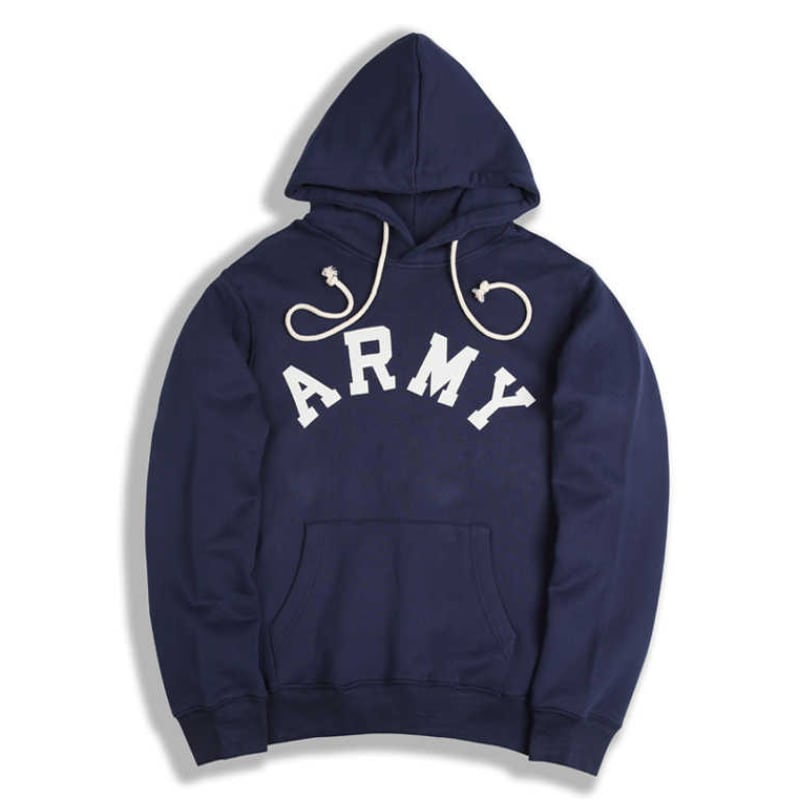 軽いフリース効果のある厚手の520gのテリーボトムスウェットシャツ生地で作られており、生地は非常に厚く、帽子部分は二重構造でしっかりした作りです。フロントにはミリタリー風のARMYプリント、バックには大きなAプリントが 施されおり、 カンガルーポケットのデザインが男女問わずお使いいただけます。